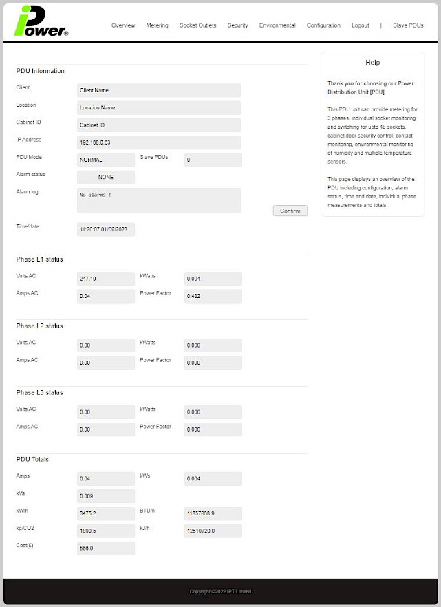 iPower® IP1 is a 3rd Generation energy monitor providing local and remote overall / Strip level energy monitoring with better than 1% Accuracy. Manufactured as a single, dual, or Three phase unit capable of loads up to 125Amps and can be built as an Inline unit or as a multi socket Power Strip incorporating any type of Socket and Mains Lead termination. iPower® IP1 Also has environmental ports for the connection of Temperature and Humidity Sensors, Security Ports for Access Control, Volt Free Conects, and a USB Port plus units can be daisy chained so up to 32 devices can be monitored through a single IP Address. All units have a fitted display and can be remotely monitored through the network port via the internal web browser or over SNMP and Telnet, plus others.