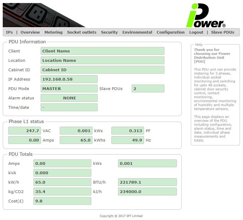 The iPower PDU has the following internally monitored Energy Readings, Voltage (True RMS Reading) Current (True RMS Reading) Kilowatt Hour (Cumulative Reading), Class II Accuracy (Billing Quality). Kilograms of CO2 (Cumulative Reading). Kilo Joules, Kilowatts, Power Factor, BTU’s (British Thermal Units) Also additional readings include Peak Current, Peak Voltage, kVA. All calculations are made using a True Power Factor reading, (Not an Assumed Power Factor); The Power Factor reading is key as this provides the accuracy for the Kilowatt readings and is dependent on the type of equipment drawing power.